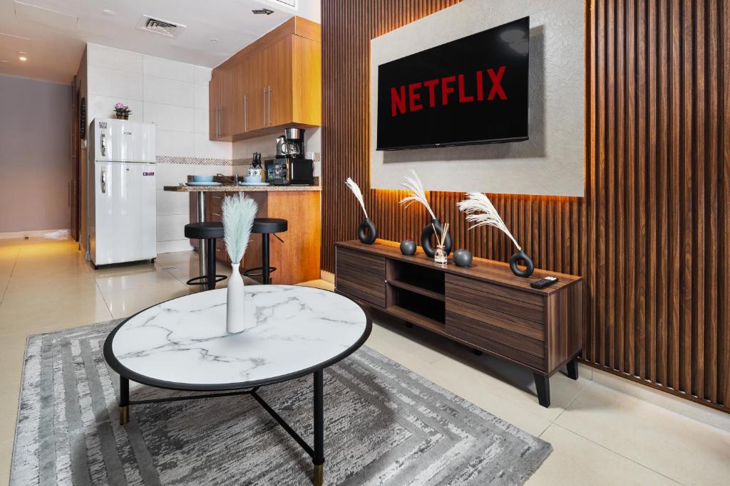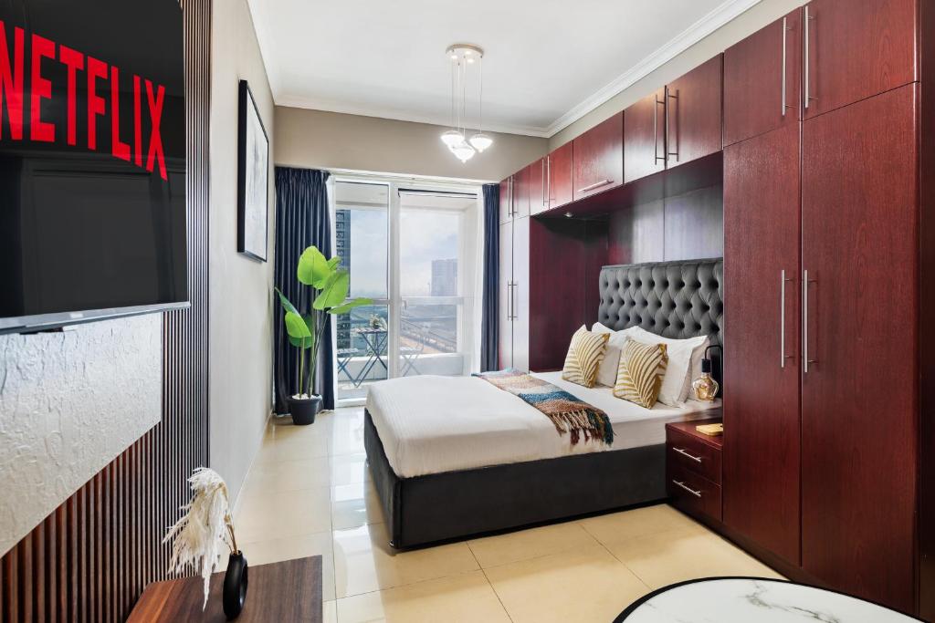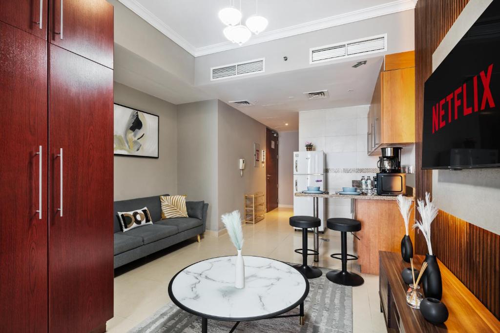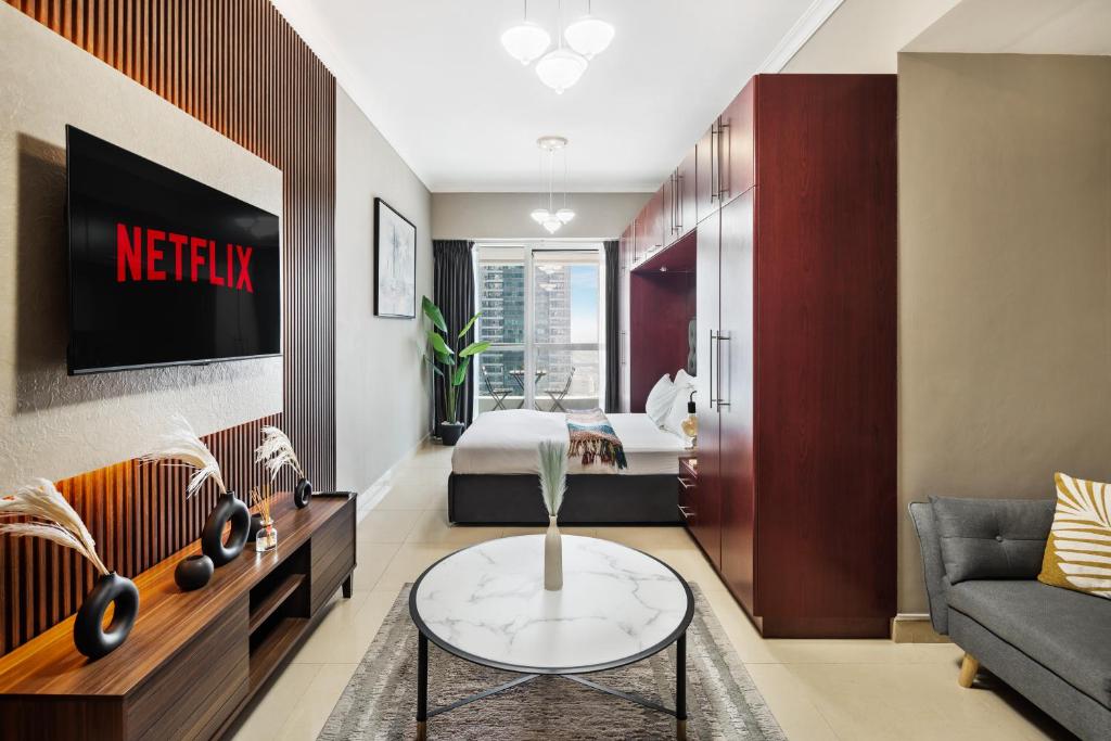 ورود به آپارتمان مبله برای اجاره در صبا 3، Jlt از ساعت 15:00 و خروج از اتاق تا ساعت 11:00 صبح است.