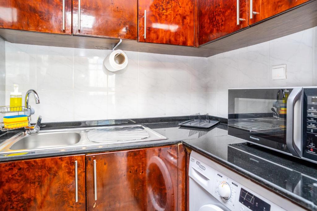 مبلمان آشپزخانه کاملاً فرسوده. چند ظرف. نوسانات فشار و دمای آب دوش.