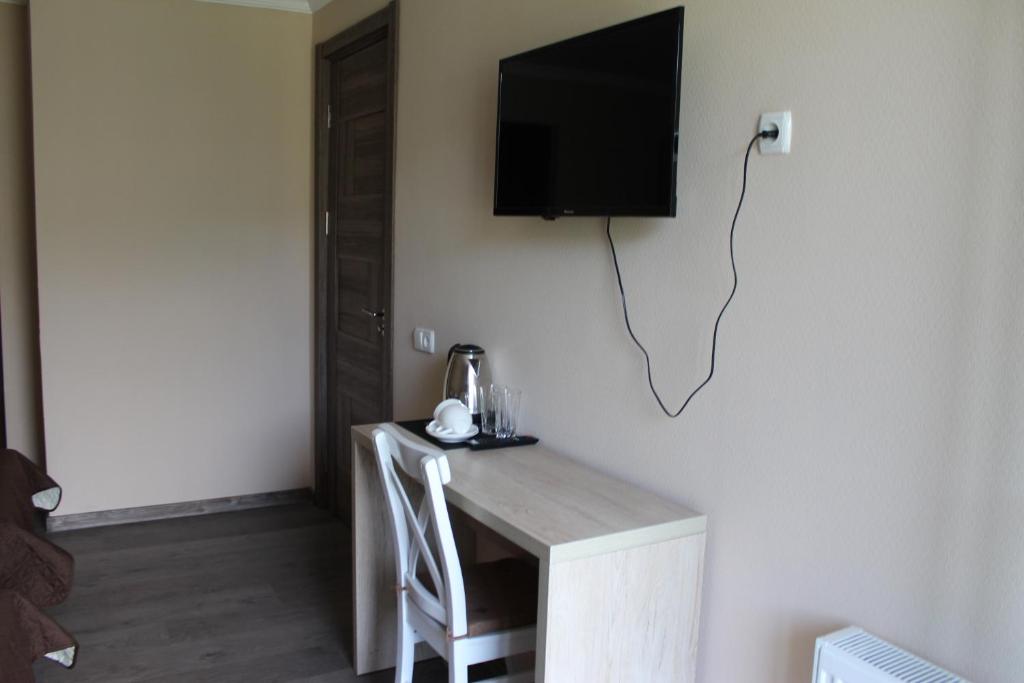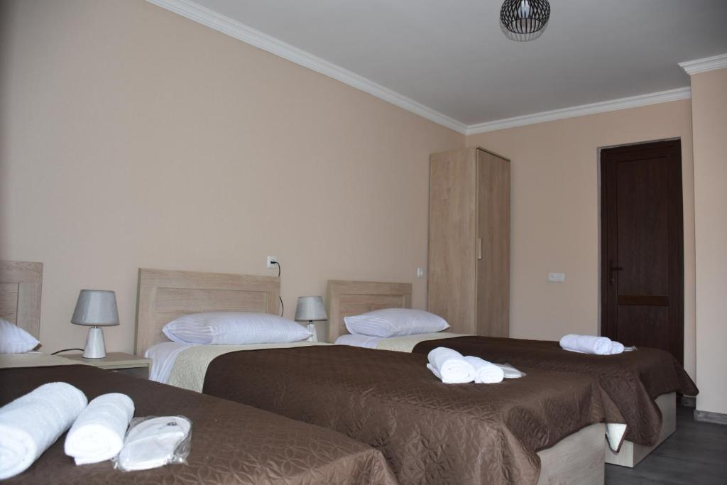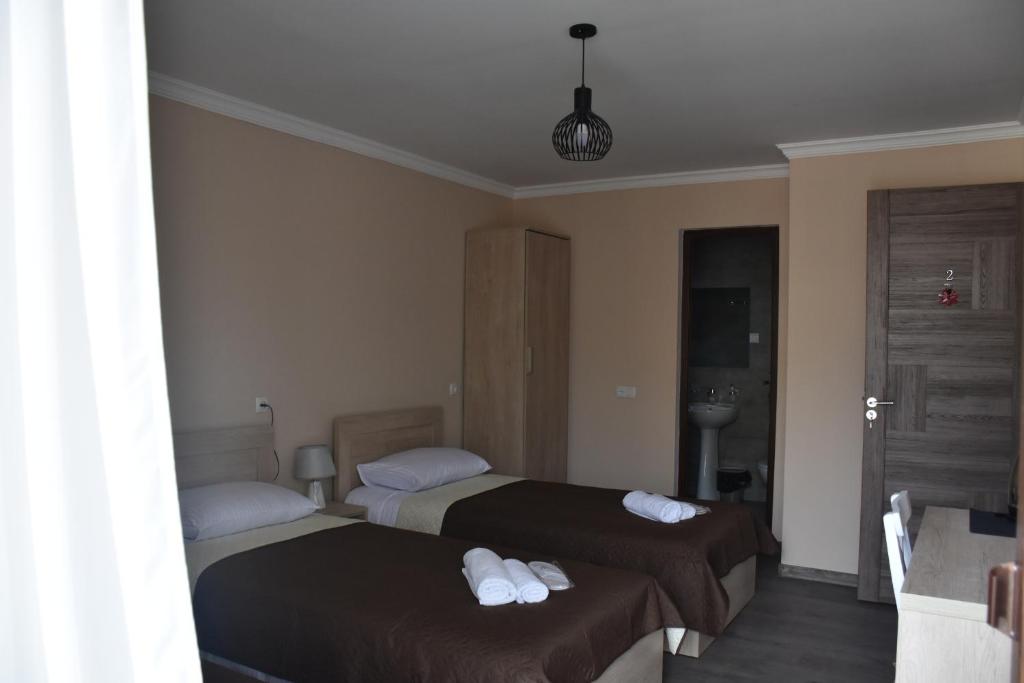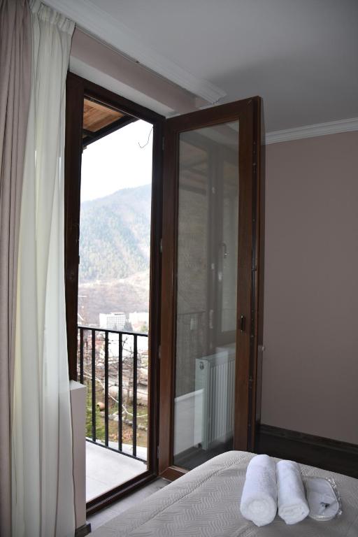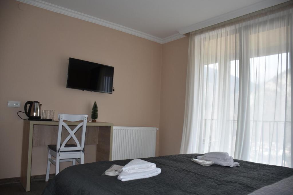 هتل کمی مرتفع واقع شده است، اگر با ماشین مشکلی نداشته باشید، بالا رفتن از کوه با پای پیاده دشوار خواهد بود. اما از بالکن یک منظره عالی وجود دارد، یک مبل و یک میز روی آن قرار دارد، می توانید با منظره ای باشکوه از برجومی بنشینید. اتاق به اندازه کافی بزرگ است، یخچال، کتری، فنجان، لیوان وجود دارد. یک آشپزخانه مشترک در طبقه پایین وجود دارد که در آن می توانید چیزی بپزید یا وسایل لازم را بردارید.