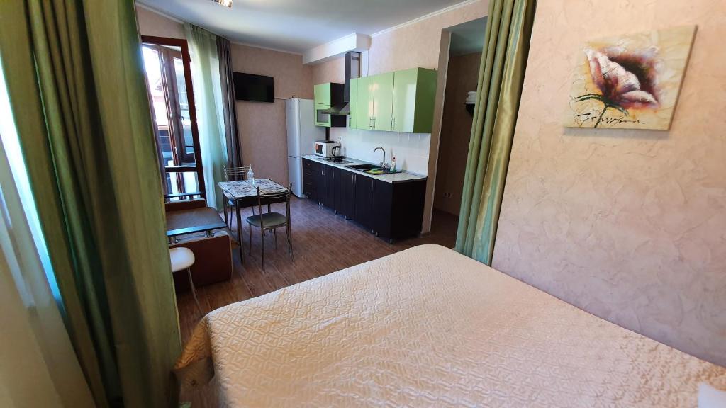 خود اتاق تمیز و راحت است (بسیار شبیه به اتاق های آپارتمان های شبکه گورکی-گورود). یک یخچال بسیار بزرگ، یک ماشین لباسشویی، یک آشپزخانه کامل، یک مبل تخت خواب شو تاشو جادار راحت برای نفر سوم، یک دوش ضد نشتی و یک کابین. به طور کلی، هیچ چیز و کسی برای شکایت وجود ندارد.