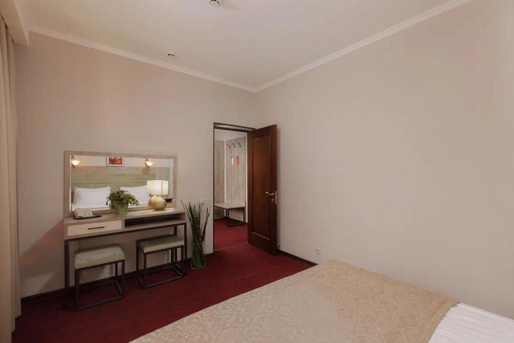 دکوراسیون اتاق زاهدانه است، اما هر چیزی که نیاز دارید وجود دارد. وضعیت کمی "فریبنده" است: لکه روی فرش، مبلمان فرسوده شده است. حمام مدت زیادی است که بازسازی نشده است. کانال های تلویزیونی کمی وجود دارد، سیگنال ضعیف است. از تاریخ 2021/12/29، نمای اتاق به محل ساخت و ساز. به طور کلی، شرایط 3 منهای است.