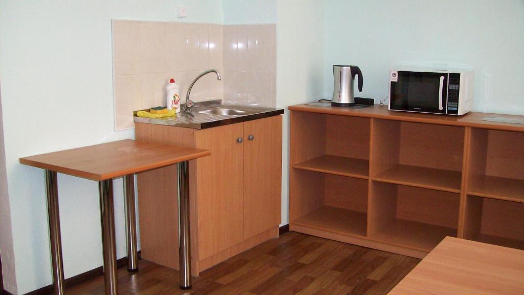 کمی دور از توقف. هیچ ظرفی در آشپزخانه وجود نداشت-خیلی راحت نیست. فقط مایکروویو و یخچال