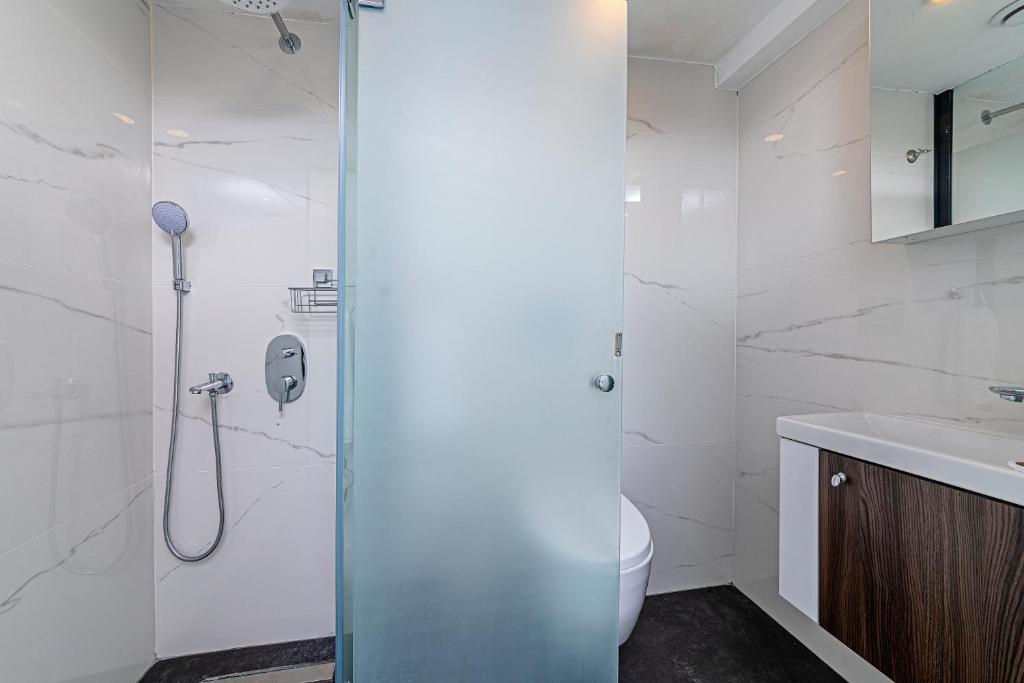 حمام بدون اگزوز و ساخته شده از پارتیشن شیشه ای در داخل اتاق بدون کنترل جریان آب