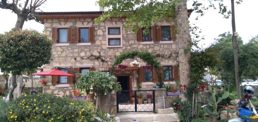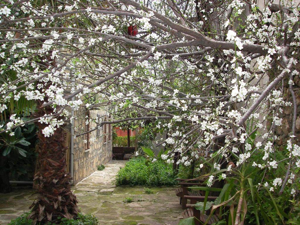خانه سنگی زیبای قدیمی با باغی بزرگ در اطراف، پر از گل ها و درختان شکوفه.