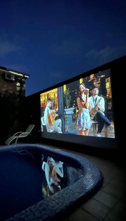 استخر خنک است، می توانید در زیر آسمان باز فیلم تماشا کنید.