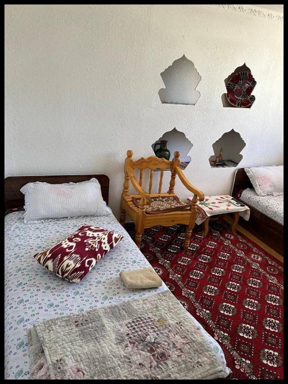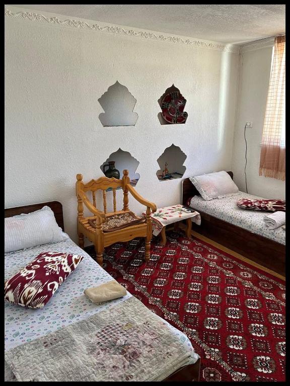 اتاق کوچک، جایی برای گذاشتن چمدان نیست. فضای داخلی ساده است، بدون قلاب روی دیوارها برای آویزان کردن لباس ها. دیوارها با رنگ سفید رنگ آمیزی شده است. صبحانه ها بسیار ساده است، دلچسب نیست، اما میزبانان خواسته های مهمانان را در نظر می گیرند. تشک ها مانند تقریباً در همه جای ازبکستان کمی سخت هستند.