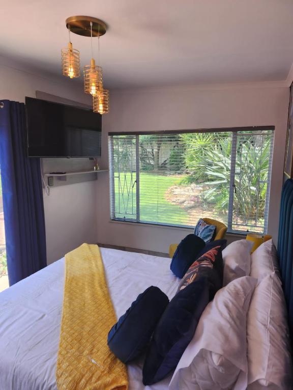 کیفیت تمام وسایل، حریم خصوصی، تلویزیون بزرگ، نور مرکزی روشن در اتاق خواب.